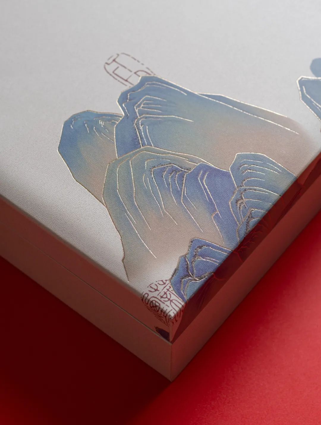 在禮盒“江山”印刷時,我們選用有色特種紙,加以四色印刷燙金。為了避開特種紙的特性局限,山石的石青渲染印刷時在每個獨立圖層下增加漸變白墨打底再上色,達(dá)到石青、石綠兩種顏色層次??紤]到增強(qiáng)整體山勢恢弘壯闊的效果,便在山石輪廓上增加燙金工藝,提亮色澤的同時渲染出金山碧水的效果。包裝是產(chǎn)品的第一眼,營銷從消費者看到包裝的那一瞬間即開始。只有立足當(dāng)下,解決未來的問題,包裝和品牌才能主動出擊收割產(chǎn)品更多的賣點。