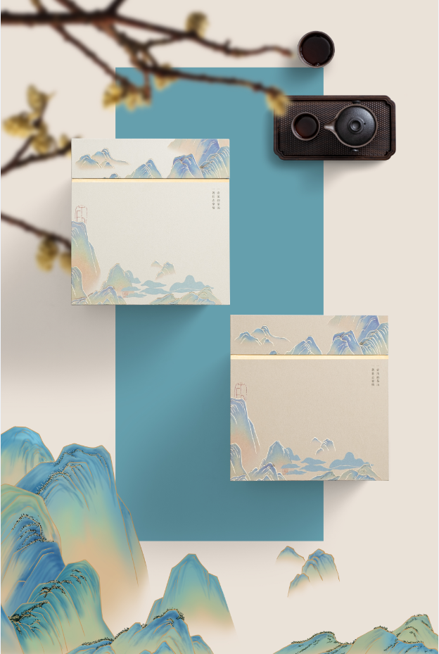 禮盒“江山”取材自北宋名畫《千里江山圖》,沿用原畫構(gòu)圖,通過散點(diǎn)透視法描繪局部山水,用線性的畫面結(jié)構(gòu)表現(xiàn)平遠(yuǎn)的青山綠水圖景,并將主題“江山”以山的形狀融入到畫面中,既不突兀,又有意境。