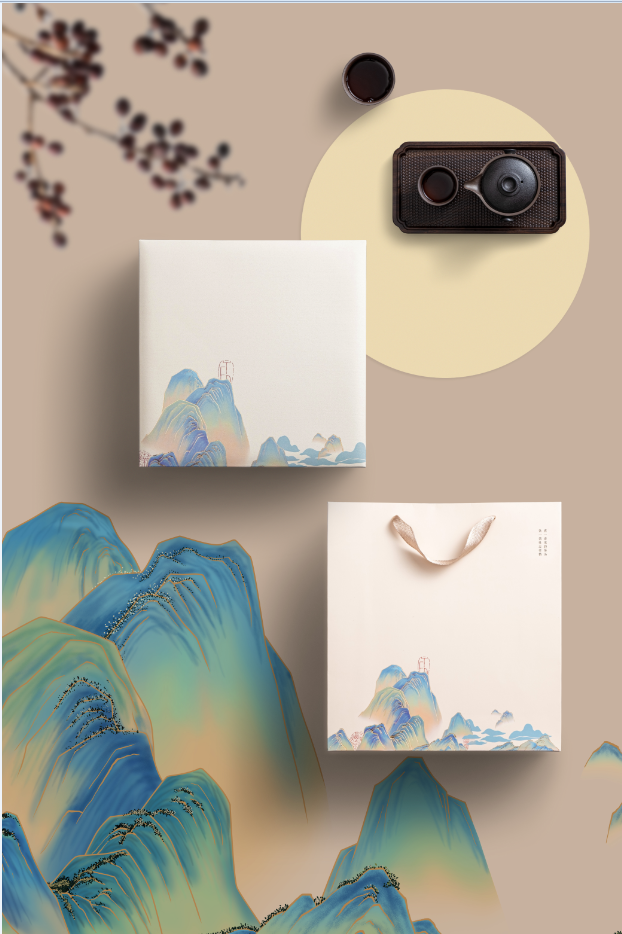 禮盒“江山”取材自北宋名畫《千里江山圖》,沿用原畫構(gòu)圖,通過散點(diǎn)透視法描繪局部山水,用線性的畫面結(jié)構(gòu)表現(xiàn)平遠(yuǎn)的青山綠水圖景,并將主題“江山”以山的形狀融入到畫面中,既不突兀,又有意境。