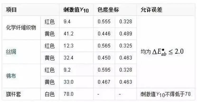中華人民共和國國家質(zhì)量監(jiān)督檢驗檢疫總局和中國國家標(biāo)準(zhǔn)化管理委員會頒布的《GB 12983-2004:國旗顏色標(biāo)準(zhǔn)樣品》準(zhǔn)確規(guī)定了國旗所使用的顏色。該標(biāo)準(zhǔn)按照CIE標(biāo)準(zhǔn)照明體D65和CIE 1964補(bǔ)充標(biāo)準(zhǔn)色度系統(tǒng)給出了下列的色度數(shù)據(jù)。