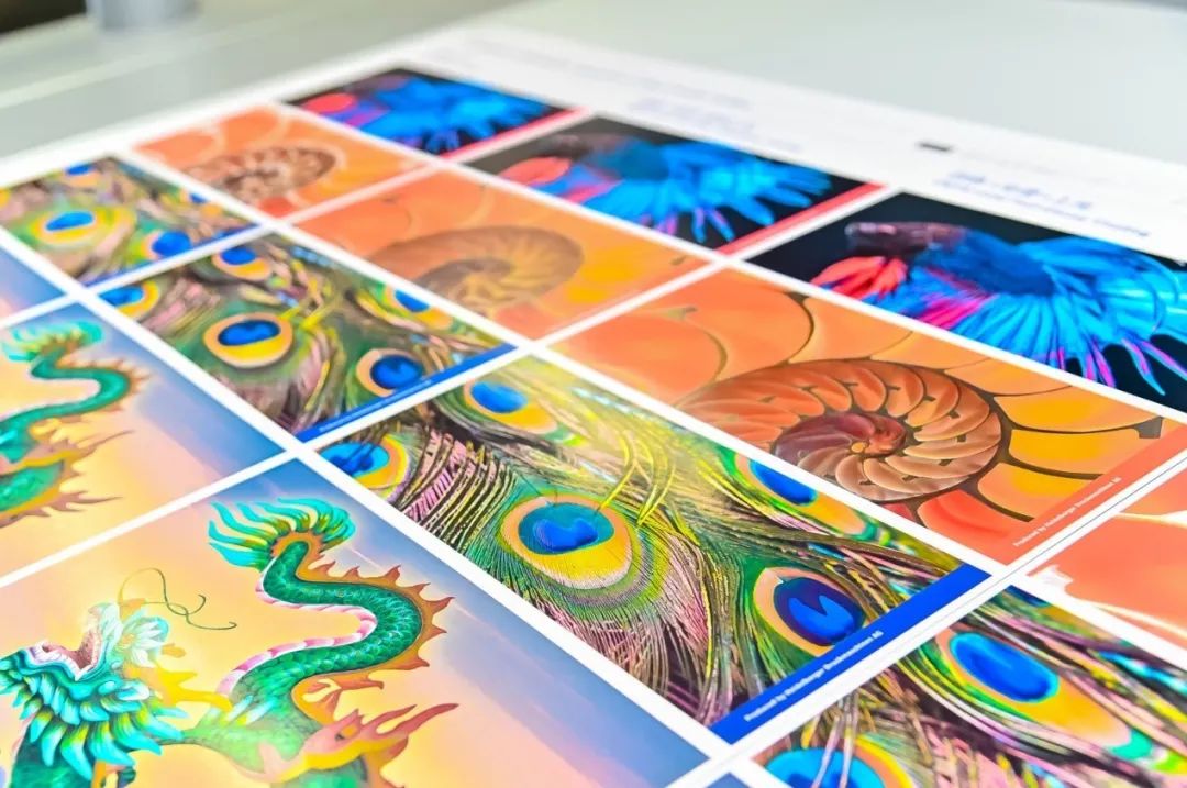 “第一列圖案是四色印刷加UV上光效果,第二列圖案是四色印刷+冷燙+逆向上光的效果,大家可以看到由于通過冷燙的銀箔直接被印在紙張表面,龍的鱗片顯得銀光閃耀,同時逆向上光工藝的采用,使孔雀羽毛局部出現了明顯的立體紋理效果,和光油的高光形成對比;然后第三列圖案是四色印刷+冷燙+UV上光的效果,第四列圖案是四色加逆向上光的效果,沒有冷燙工藝,局部出現了磨砂效果,和光油的高光形成對比。”直播間里,海德堡專家為觀眾們做了細致的闡釋。
