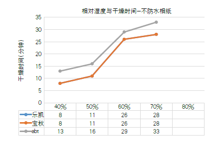 圖2 樂凱、寶秋、阿博特3種不防水相紙?jiān)?5℃室溫的干燥時(shí)間對比圖