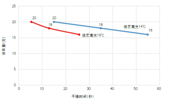 同樣涂布量,環(huán)境溫度不同,干燥時(shí)間的差異也非常大,如圖1所示,室溫分別為19℃和14℃的干燥時(shí)間,溫度高5℃,干燥時(shí)間縮短一半。