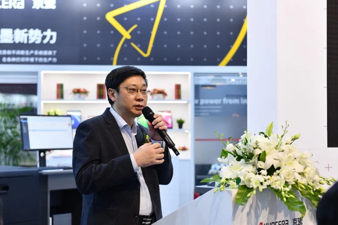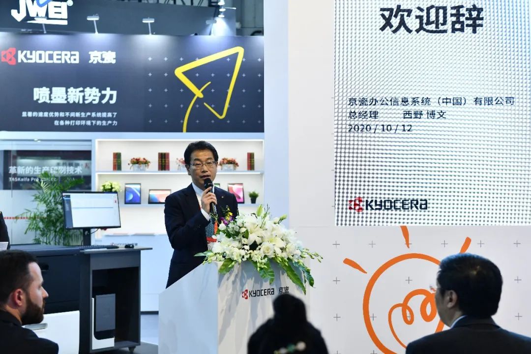 為了使觀眾更好地了解該產(chǎn)品,京瓷于10月12日下午2點于展位(N1A229)進行了“噴墨新勢力”主題產(chǎn)品發(fā)布儀式。上海數(shù)字印刷協(xié)會會長薛平先生,也蒞臨現(xiàn)場為大家?guī)眍}為《2020 技術(shù)改變未來》的精彩分享?,F(xiàn)場觀眾在第一時間感受到了來自京瓷的創(chuàng)新生產(chǎn)印刷技術(shù)帶來的改變。該新品發(fā)布會也通過京瓷官方微信公眾號(京瓷辦公信息系統(tǒng))進行了全程視頻直播。