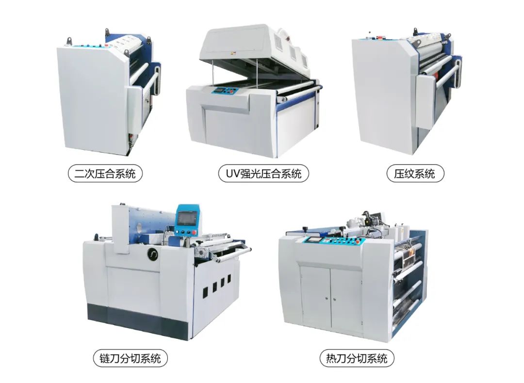 ①二次壓合系統 ②UV強光壓合系統 ③壓紋系統 ④鏈刀分切系統 ⑤高端熱刀分切系統 ⑥噴碼系統……