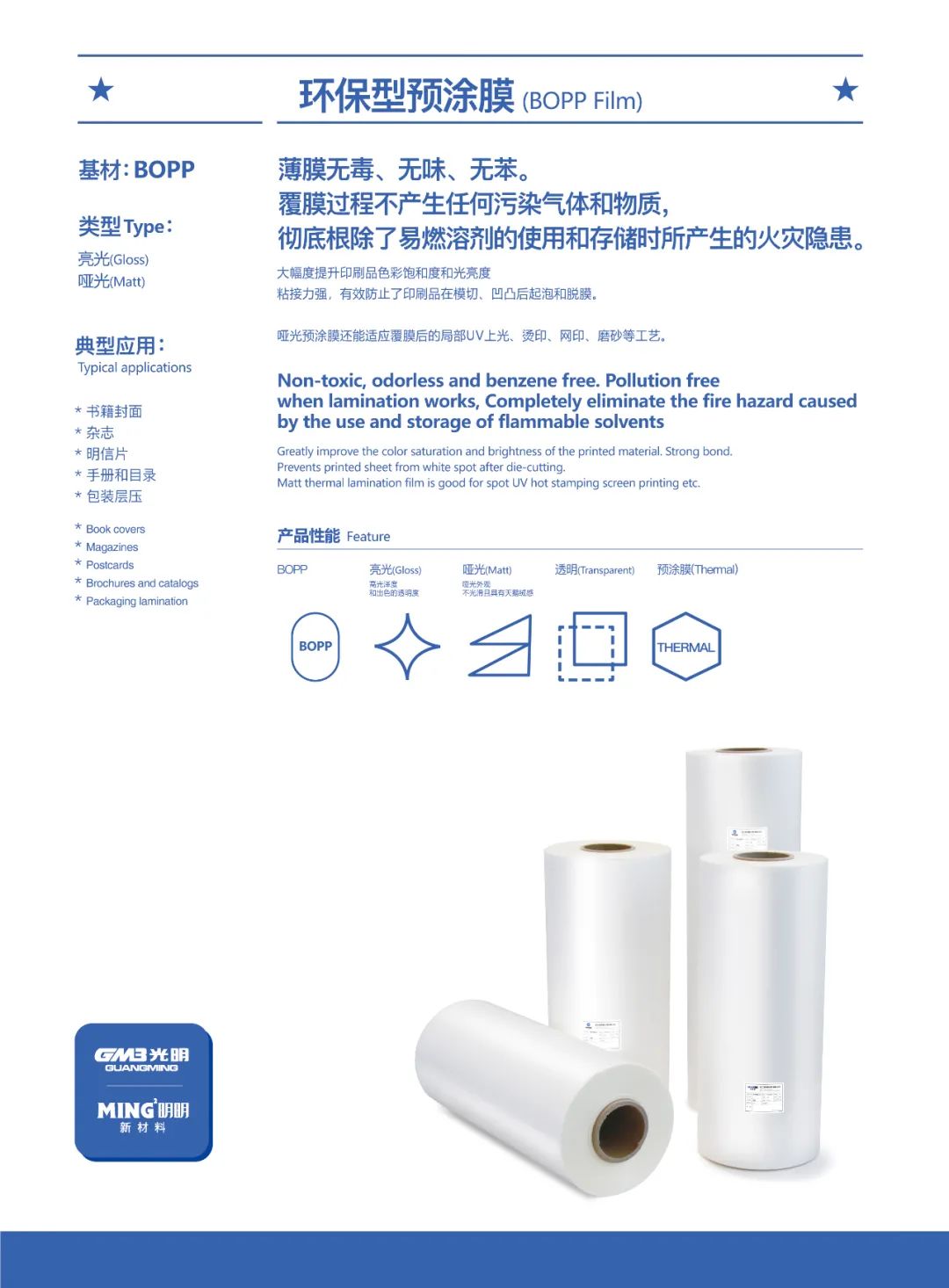 明明新材料主打BOPP預涂膜,PET預涂膜,兼顧數碼壓紋膜、觸感膜、防爆膜……等,品類齊全,全面滿足客戶需求。