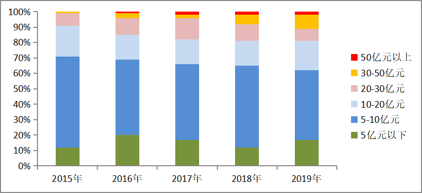 圖5是最近5屆百強的規模分布情況。大家請看下黃色框和紅色框,分別表示銷售收入達到30億元和50億元的企業。2015年榜單中,只有1家超過30億元;到最近一次百強榜,已經有11家企業超過30億元,其中不僅有超過50億元的,也出現了超過百億元的企業。這就是超大規模企業的集約化發展進程,可以預見,十四五期間,超大規模企業的發展速度還會加快,很有可能出現一批百億元企業。