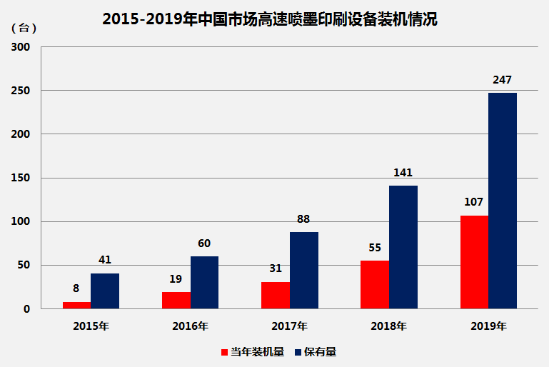 如圖所示,數字印刷的主力機型——高速噴墨印刷機,截至2018年國內市場的總裝機量是141臺,2019年這一年的增量是107臺。書刊印刷、商業印刷企業都有不少裝機。裝機量突然爆發,一是需求在進一步啟動;還有很重要的一點,國內數字印刷設備生產商發展很快,也為印企進入數字印刷市場提供了更多選機的可能、成本降低的可能。