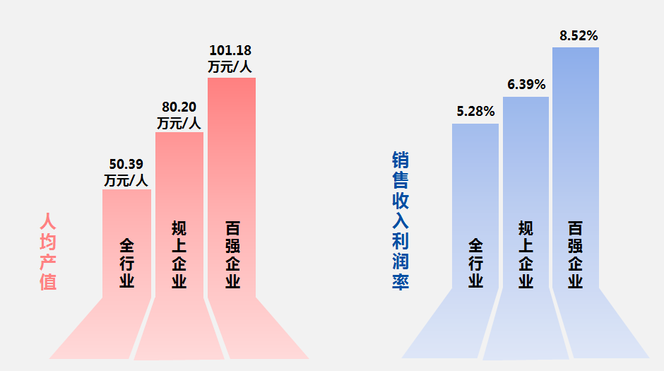 那么,不同規模類型的企業,效益水平是否有所差異?圖7中,針對人均產值、銷售收入利潤率兩個效益指標,進行了全部企業、規上企業(年營收5000萬元以上)、百強企業的對比分析。從2019年的數據中可以看出,百強企業的效益水平最優,這也會成為全行業比學趕超的標桿。