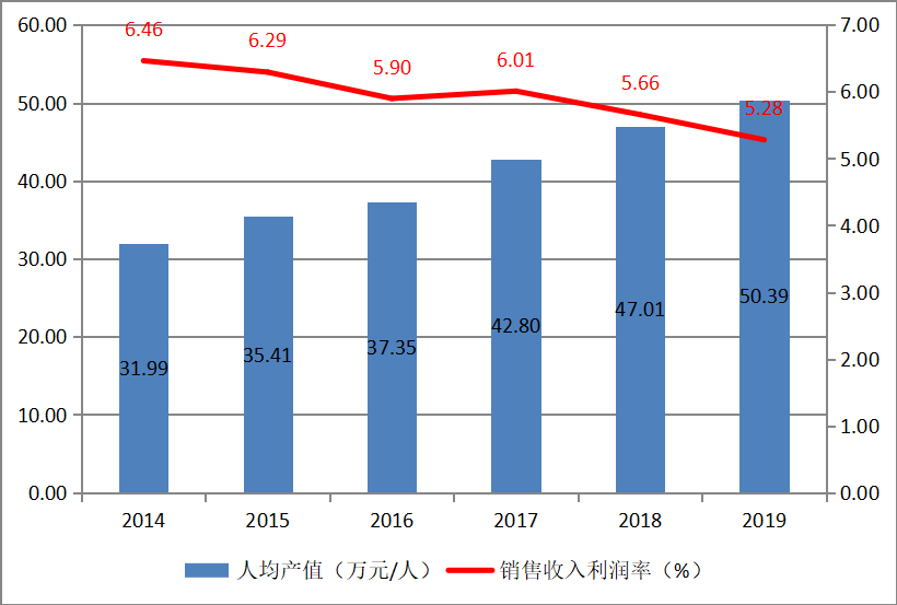 人均產值,大家請看藍色柱子,從2014年到2019年,每年都在提升,2019年相比2014年提高了近1.6倍。這表明全行業減人增效的效果,還是很可觀的。