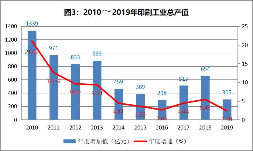 10年來,每年行業的工業總產值絕對值,還是增加的。高的年份,超過1000億元;低的年份,像2019年,也在300億元左右。這是印刷產業發展的基本盤:雖然增長速度每年在回落,但產業規模每年還在增長,整體發展還比較有序。