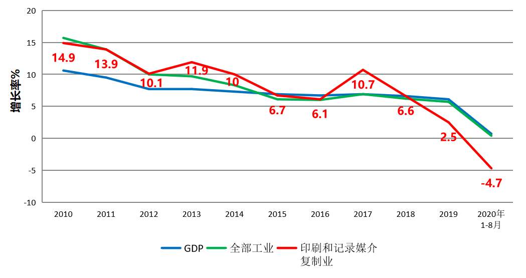 圖中標出了印刷業10年來的增速。前5年,基本還是兩位數的增長,但近5年,速度逐年走低。今年因為疫情,會是歷史上的最低點。