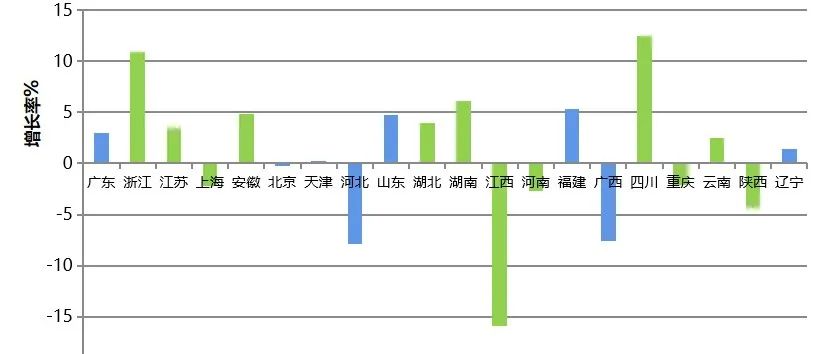 從印刷工業總產值變化來看(圖4),2019年相比上年,全國印刷工業總產值增長率為2.4%。各主要地區中,廣東持續穩定增長;長三角地區的浙江、江蘇、安徽處于增勢,上海持續下降;京津冀和山東地區,山東一枝獨秀,增長態勢良好,北京、天津增長停滯,河北降幅較大;中部地區,湖北、湖南增速明顯,江西處于下行;西北西南地區,四川、云南發展較好;東北三省,普遍比較低迷,遼寧于去年止跌,有小幅增長。