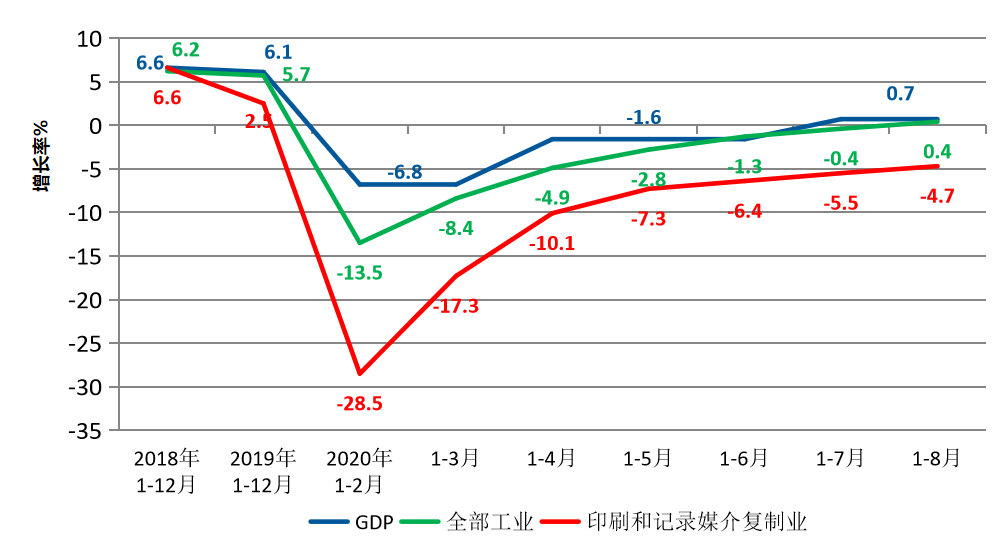 圖2:2010~2020年1-8月GDP、全部工業及印刷業增加值累計增長速度