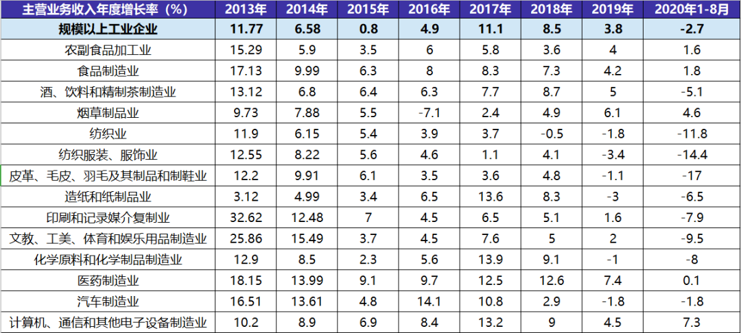 表1:部分工業行業2013~2020年1-8月主營業務收入變化情況