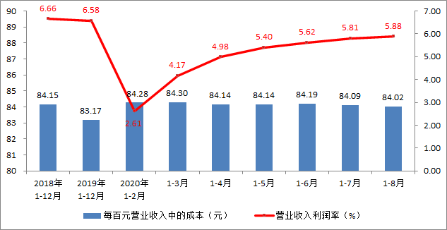 2020年1-8月,印刷業(yè)每百元營業(yè)收入中的成本為84.02元,與1-7月的數(shù)值基本持平(請(qǐng)見圖4),略低于全部工業(yè)84.35元的平均水平。