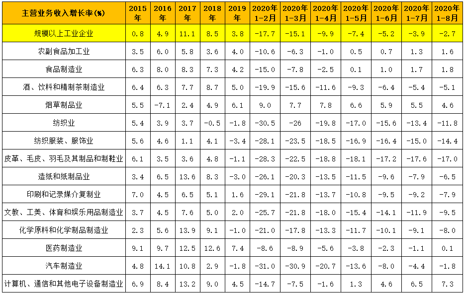表1:部分行業(yè)主營業(yè)務(wù)收入增長(zhǎng)率