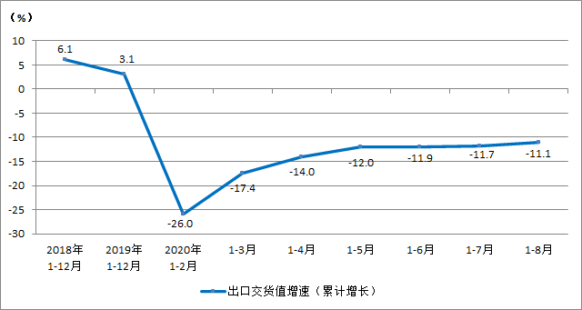 2020年1-8月,印刷業(yè)出口交貨值同比下降11.1%,與1-7月同比下降11.7%相比,降速有所緩和。