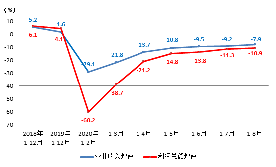 2020年1-8月,印刷業(yè)規(guī)模以上企業(yè)實(shí)現(xiàn)營業(yè)收入,同比下降7.9%;實(shí)現(xiàn)利潤總額,同比下降10.9%。利潤總額降速大于營業(yè)收入降速。
