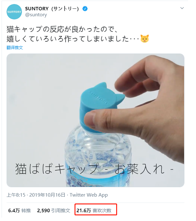 當(dāng)年10月,三得利又一次性推出8款升級(jí)版“貓咪瓶蓋”,讓瓶蓋兼具藥盒、存錢罐、按摩器等多種功能,引起網(wǎng)友們的熱烈討論,三得利官方推特中,當(dāng)條推文點(diǎn)贊數(shù)達(dá)到21.6萬(wàn),而三得利日常推文的點(diǎn)贊數(shù)只在400左右。可以說(shuō),這一次“瓶蓋創(chuàng)意”,讓三得利品牌的關(guān)注度暴漲500倍!