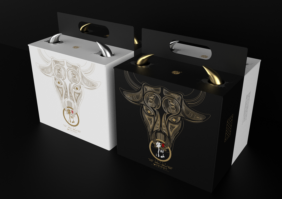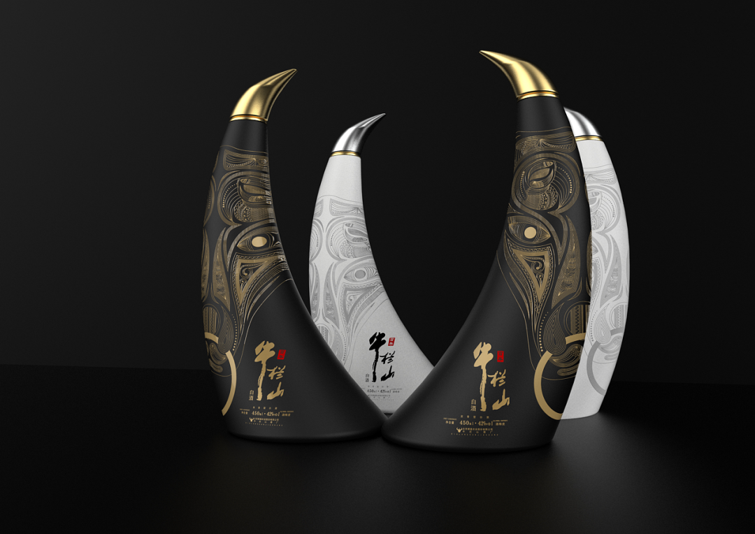 這款牛欄山牛角瓶,瓶蓋迎合瓶身整體設(shè)計(jì)成牛角形狀。裝在盒中,兩個(gè)牛角還會(huì)從盒頂伸出,與外包裝盒設(shè)計(jì)形成一只大牛頭,與品牌名相貼合,真是“牛氣沖天”。