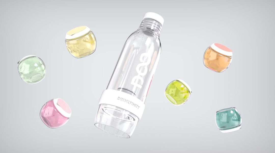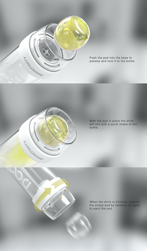 2018年,百事推出一款“Drinkfinity”便攜飲料,“豆莢”中含有濃縮果汁、固體粉末等物質(zhì),將瓶中灌滿飲用水,“豆莢”放在瓶口,釋放,便是一整杯果汁。