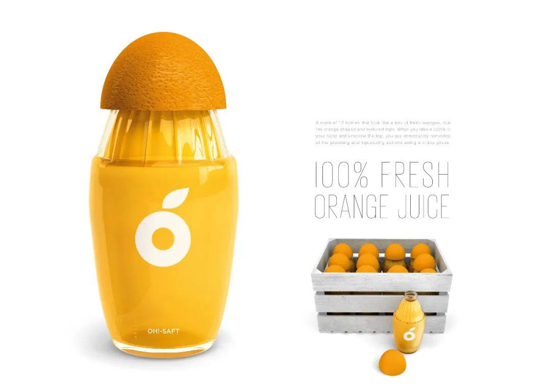 除了體現(xiàn)飲料的清涼,能否用瓶蓋設(shè)計(jì),體現(xiàn)出果汁的極致新鮮?當(dāng)然可以!不如將瓶口做成手動(dòng)榨汁機(jī),瓶蓋做成一只大橙子吧!