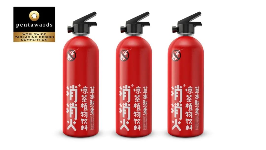 看完了炸彈,不如來(lái)杯涼茶降降火。如何設(shè)計(jì)才能展現(xiàn)出涼茶的降火效果?干脆將瓶子設(shè)計(jì)成滅火器吧!瓶蓋就是滅火器的噴頭。這項(xiàng)設(shè)計(jì)也成功拿下了2017Pentawards飲料類銀獎(jiǎng)。