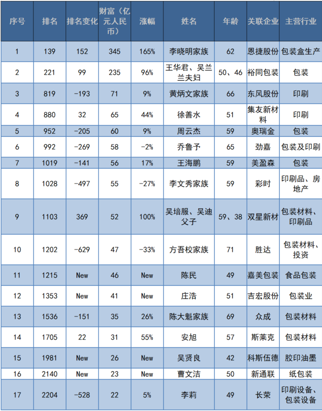 入選“2020胡潤百富榜”的印刷包裝行業企業家共有17人(家族),比去年多出4人,占全部上榜人數2398的0.71%。這17人共計擁有財富1237億元,同比增加62.3%,見下表。