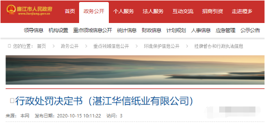 據行政處罰行政決定書顯示,2019年11月15日,湛江市生態環保局對湛江華信紙業有限公司進行現場檢查,發現該公司正常生產,廢水治理設施正在運行。但在其廠外廢水排放口進行的監督性檢測報告顯示,湛江華信紙業有限公司排放的廢水中的懸浮物為43mg/L,超過《制漿造紙工業水污染物排放標準》標準限值(懸浮物:30mg/L)的0.43倍。對此有關部門對其作出罰款人民幣10萬元的行政處罰。
