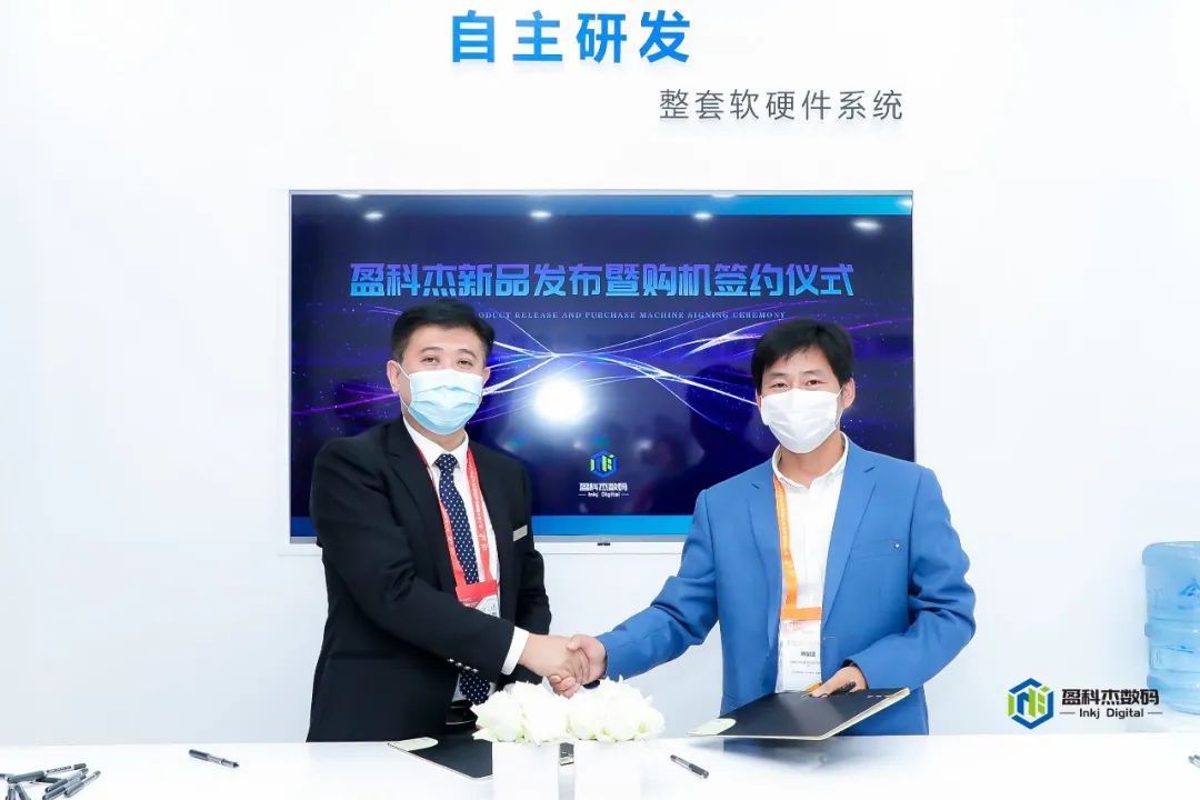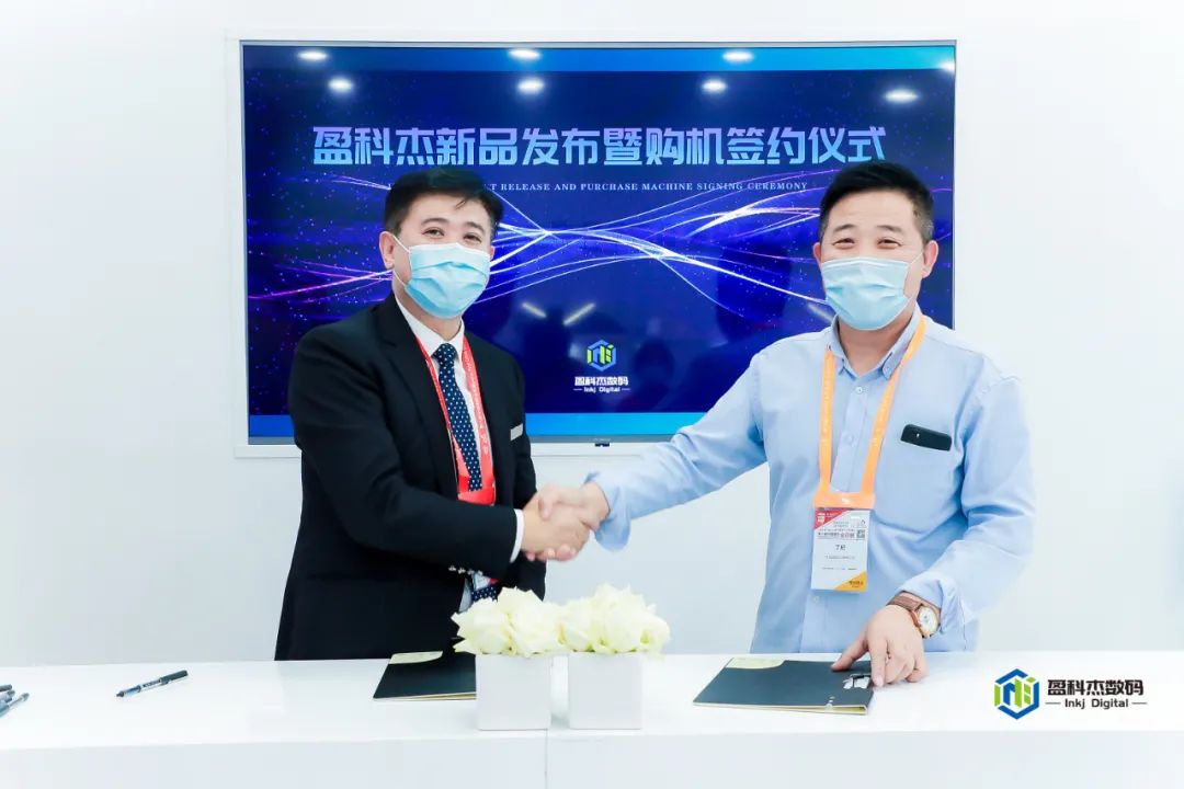 2020年10月12日,以“杰出精彩 盈在未來”為主題的“盈科杰彩色噴墨發布暨購機簽約儀式”在上海新國際博覽中心盈科杰展位(展位號:N1A319)成功舉辦,盈科杰總經理譚明主持了新品發布會。首次亮相全印展的盈科杰雖然僅成立兩年多,但盈科杰創始人在行業深耕幾十年的積淀,讓盈科杰一出世,便在工業噴墨領域擁有一席之地。