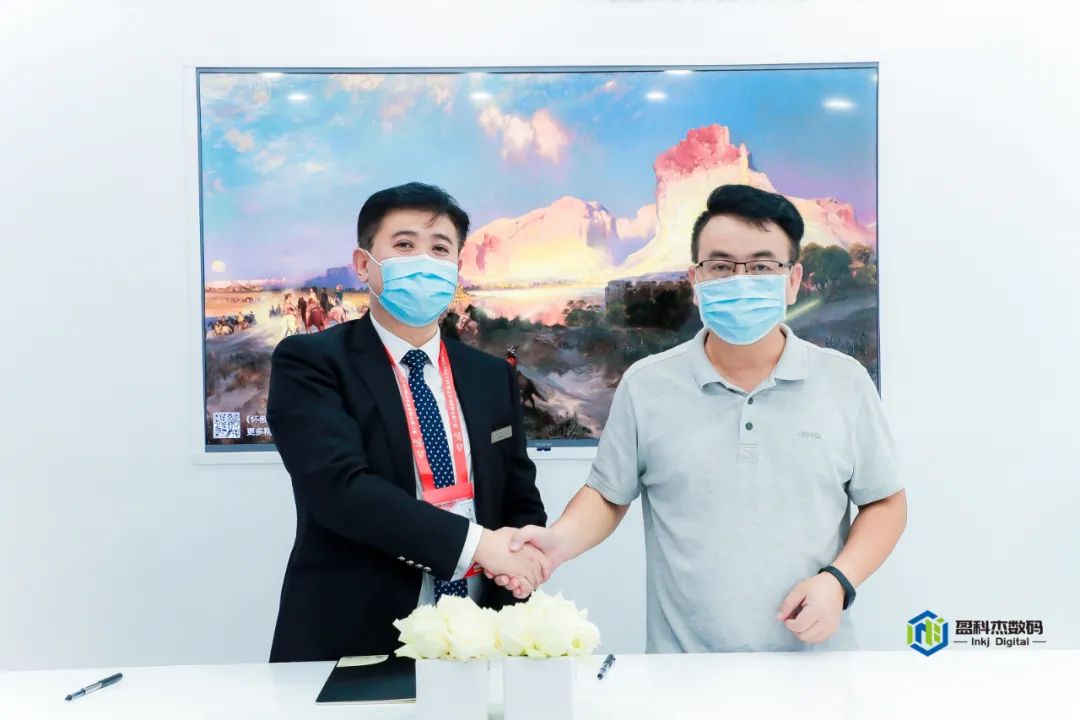 盈科杰總經理譚明(左)與廈門青友數字印刷科技有限公司董事長歐陽沅勝(右)