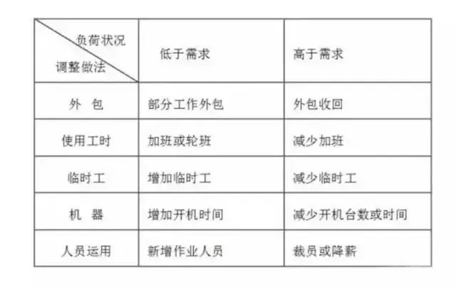 在未做好充分的事前計劃和準備,或者產品與數量有較大的變動,所產生的人力或機器負荷與需求不平衡時,可能的方法有:機器產能不足時,可考慮延長工種、工時或新增設備來提升產量;
