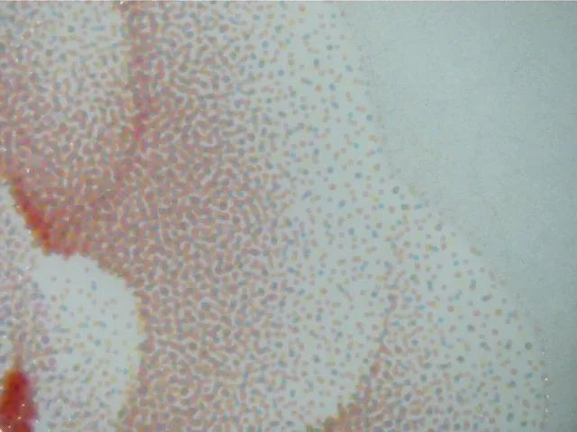 由于數碼印刷從可變數據打印發展到了書刊印刷,乃至現在的標簽印刷、包裝印刷,因此,對數碼印刷的質量評估也不得不擺上印刷界的評判臺。標簽領域的數碼印刷作品,其印刷網點基本分為兩類:一類以HP  indigo為代表模擬傳統印刷中的調幅網,如圖10所示;另一類以愛普生打樣系統為典型,實現調頻網印刷,如圖11所示。