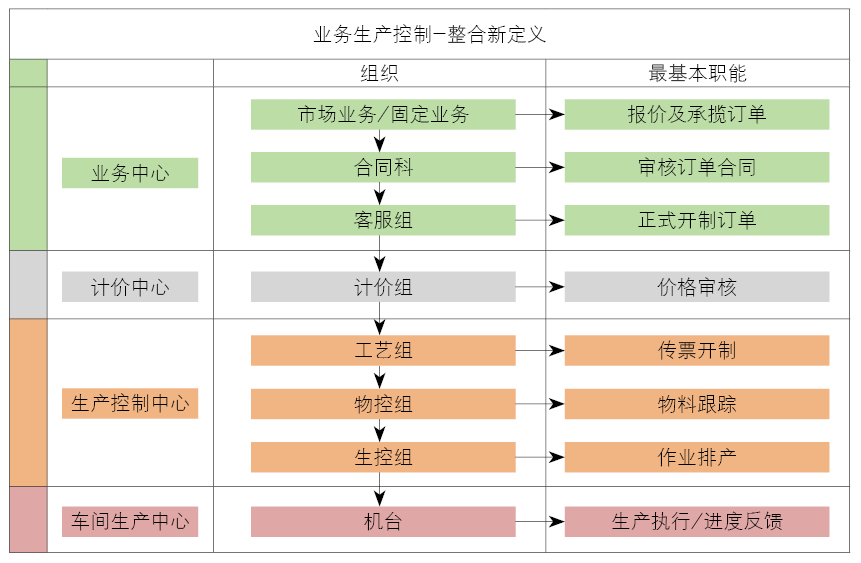 從ERP生產流程上看(圖1最左邊的列),在系統中單據穿插的部門非常多,例如,精品業務下的社會業務中,訂單開制是精品部門,而到了傳票開制和機型排產又是集團部門,到了機臺排產又變成了精品部門。可以想象,如果某個訂單需要改機型、更換車間,或臨時發外加工等特殊情況,根本就無法高效地安排生產,無法加強各個生產車間內部的管理,實際生產中我公司這種情況還不少。