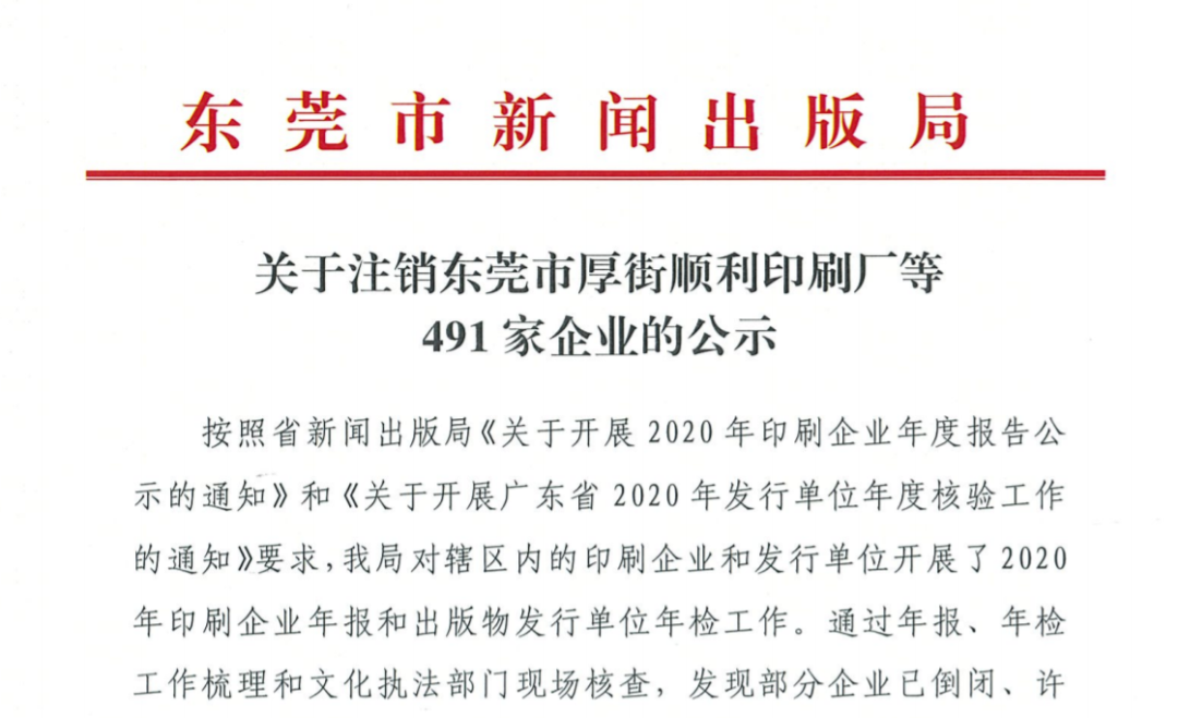 日前,東莞市新聞出版局官網(wǎng)發(fā)布了《關(guān)于注銷東莞市厚街順利印刷廠等491家企業(yè)的公示》,通過年檢、年報工作梳理和文化執(zhí)法部門現(xiàn)場核查,發(fā)現(xiàn)部分企業(yè)已倒閉、許可證已失效且沒有主動申請注銷《印刷經(jīng)營許可證》《出版物經(jīng)營許可證》等情況,為規(guī)范東莞市印刷和發(fā)行行業(yè)管理,確保基礎(chǔ)數(shù)據(jù)的準(zhǔn)確性,東莞市新聞出版局?jǐn)M注銷一批印刷企業(yè)和發(fā)行單位,共計(jì)491家。