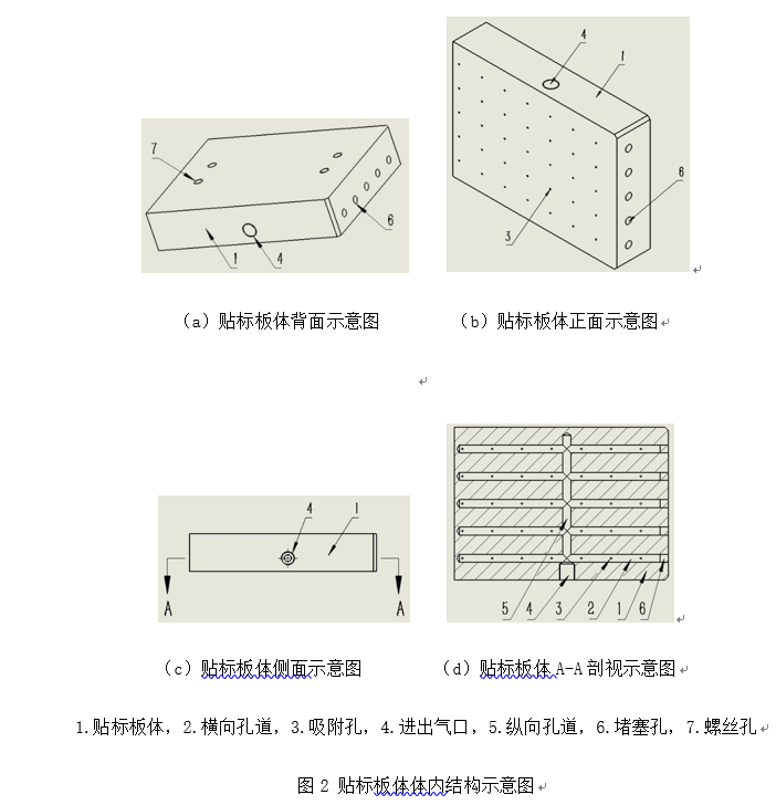 新一體式不干膠標簽用貼標板包含貼標板體、橫向孔道、吸附孔、進出氣口和縱向孔道等結構,具體結構如圖2所示。