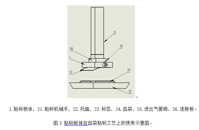 (3)當面紙貼于血袋表面后,根據指令,停止抽真空,通過外接的進出氣管空氣回流,貼標板體正面的吸附孔沒有吸附力,釋放并脫開標簽面紙,完成貼標,貼標板體在貼標機械手的作用下復位,分離下一個標簽的底紙與面紙。貼標板體在血袋貼標工藝上的使用如圖3所示。