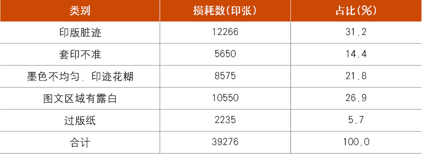 從表2可以看出,海圖印制過程中故障率較高的原因有 “印版臟跡”“套印不準(zhǔn)”“墨色不均勻,印跡花糊”“圖文區(qū)域有露白”,占比分別為31.2%、14.4%、21.8%和26.9%,累計達到94.3%。若將這4個問題有效改善,紙張損耗率就可以大大降低。