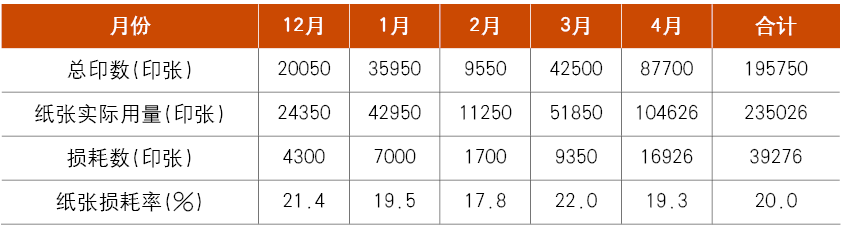 經(jīng)過連續(xù)5個月對海圖印刷紙張耗用情況進行統(tǒng)計得出,海圖總印數(shù)為195750印張,損耗數(shù)共計39276印張,紙張損耗率按照{(diào)(紙張實際用量-總印數(shù))/總印數(shù)×100%}計算,得出目前海圖印制過程中紙張損耗率月平均為20.0%,如表1所示。