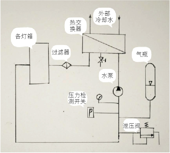 在冷卻柜前觀察機臺開停時的情況,發現開泵時壓力表顯示系統壓力下降至接近0.7bar,然后慢慢回升,停泵時壓力會突然增加超過2.5bar,泄水閥出現泄水情況,這樣反復幾次就會報故障,無法打開UV燈,這也是冷卻柜下總有水的原因所在。
