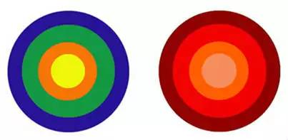 實際上這是視錯覺的一種現象,一般暖色、純色、高明度色、強烈對比色、大面積色、集中色等有前進感覺,相反,冷色、濁色、低明度色、弱對比色、小面積色、分散色等有后退感覺。