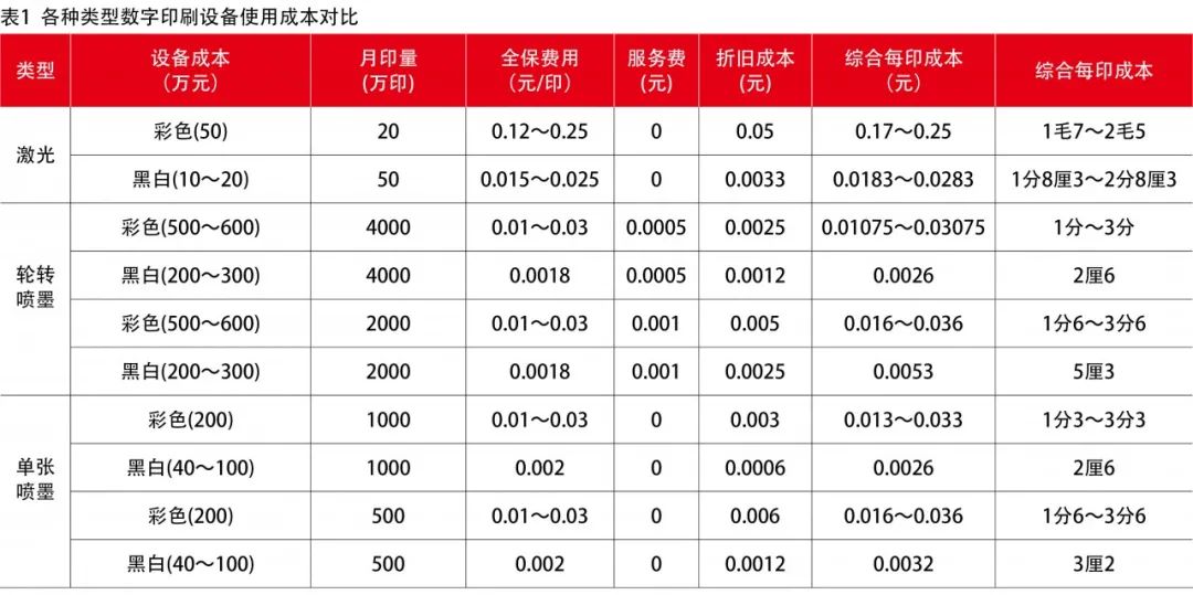 從表1各種類型數(shù)字印刷設(shè)備使用成本對(duì)比來(lái)看,在黑白印刷中,高速噴墨印刷設(shè)備不管是輪轉(zhuǎn)機(jī)還是單張機(jī)的每印成本都已經(jīng)是碳粉機(jī)的十分之一,在彩色印刷中,高速彩色噴墨機(jī)無(wú)論是輪轉(zhuǎn)機(jī)還是單張機(jī)的每印成本也已經(jīng)不足彩色碳粉機(jī)的十分之一。這個(gè)降幅對(duì)數(shù)字印刷企業(yè)來(lái)說(shuō)肯定算得上是革命性的!