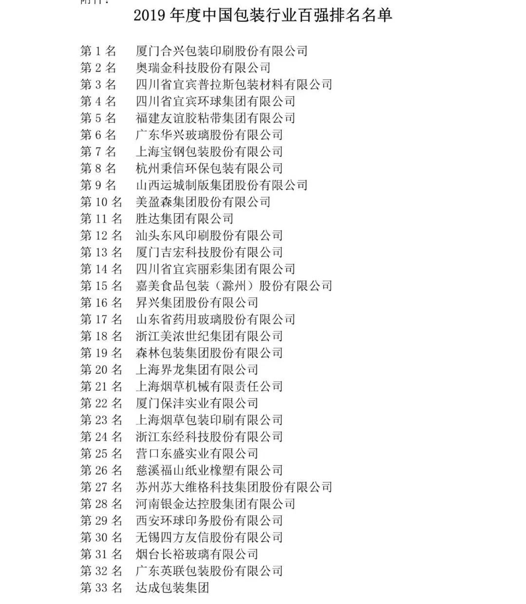 2019年度中國包裝行業百強榜公布 合興、秉信、美盈森入圍前十