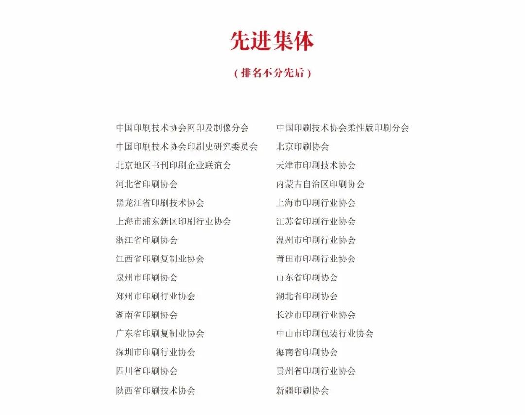 這些被授予榮譽的個人和集體,是協會會員中的先進典型,在他們身上展現出了愛崗敬業、樂于奉獻的優良品質和追求卓越、銳意創新的奮發進取精神,他們立足本職崗位建功立業,為加快我國由印刷大國向印刷強國的轉變進程,為決勝全面建成小康社會、奪取全面建設社會主義現代化國家新勝利,實現中華民族偉大復興貢獻著自己的力量。