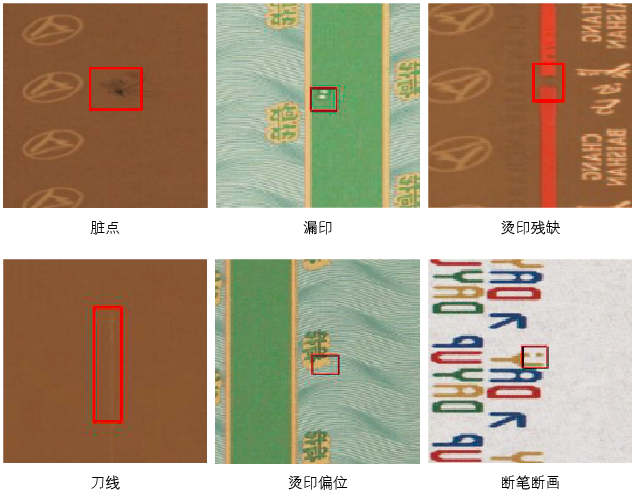 設備成功安裝驗收初期,對產品傳統瑕疵問題的檢測效果比較理想,能有效檢測出漏印、臟點、燙印偏位、刀線、色差、蚊蟲、褶皺等缺陷(如圖1所示),極大提高了檢測效率和產品質量,但高精度檢測對印刷品本身的質量提出了更高的要求,使用初期還伴隨一定數量的“誤報”。