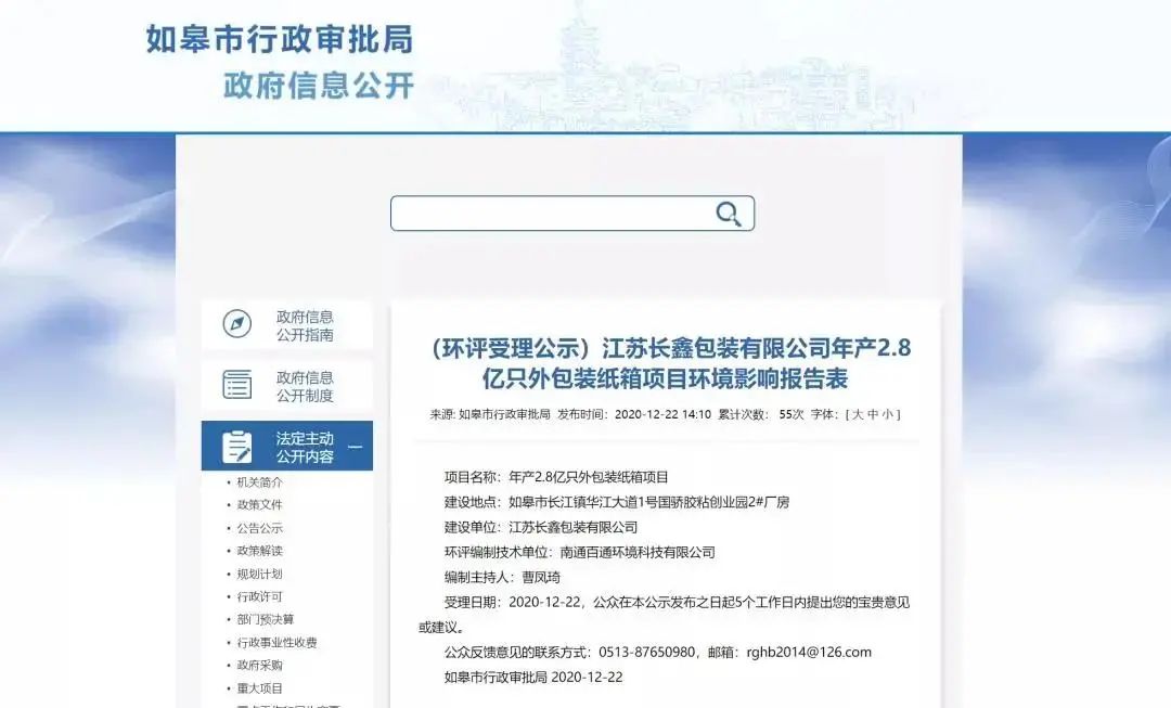 近日,江蘇省如皋市行政審批局官網(wǎng)公示,江蘇長鑫包裝有限公司年產(chǎn)2.8億只外包裝紙箱項目環(huán)境影響報告表已被受理,正在進行環(huán)評公示。據(jù)悉,該項目總投資5000萬元,預計今年年初投產(chǎn)。