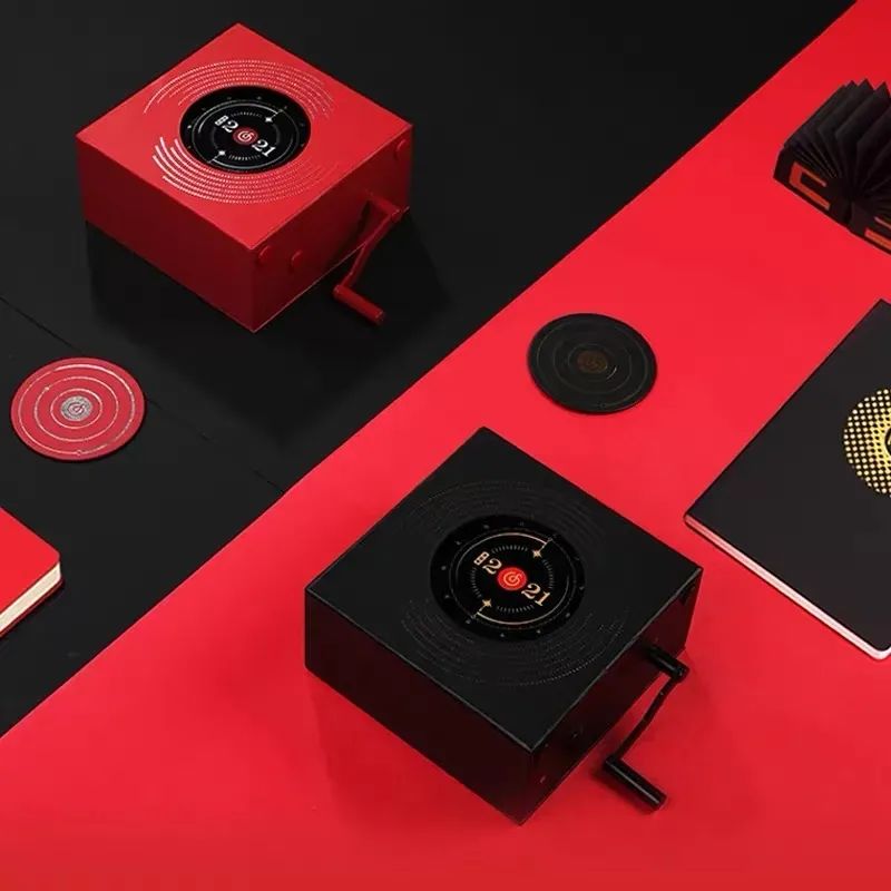 而復古桃木底座,搭配黃銅色的機械感邊框,親手轉動時間的齒輪,在營造氛圍的同時,也提升了產品的趣味性,透露出一種典雅的儀式感。