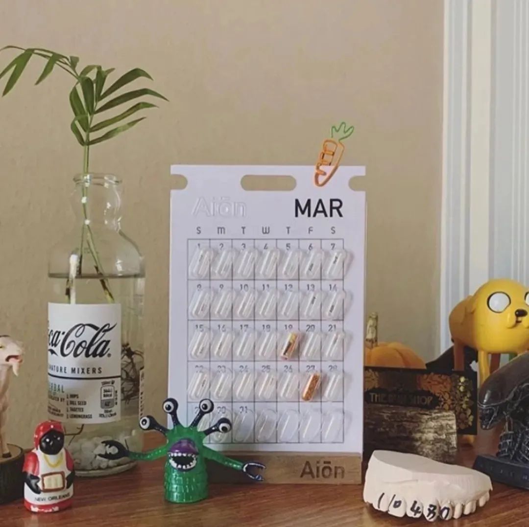 Aion的這款膠囊日歷內裝有12張帶有“空凹槽”的月歷紙板,并配備了三罐膠囊:一瓶生日彩糖膠囊、一瓶彩色小字條、一瓶未被灌裝的Aion膠囊。