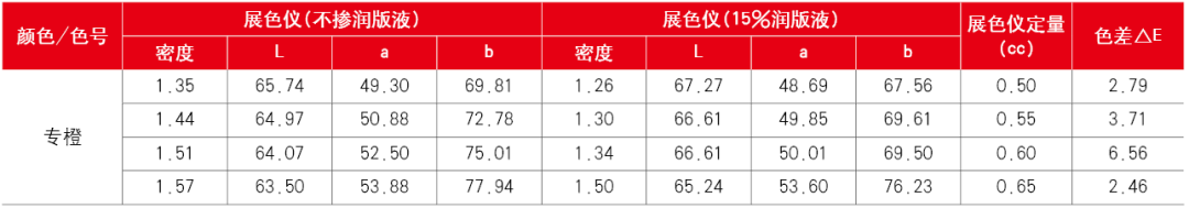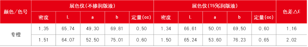 根據(jù)記錄數(shù)據(jù)可以發(fā)現(xiàn),加入潤(rùn)版液后,相同定量的油墨,展色出來的顏色密度會(huì)下降,同時(shí)色彩Lab值也會(huì)相應(yīng)變化。對(duì)比兩個(gè)樣本,可發(fā)現(xiàn)同樣規(guī)律:密度相近的顏色數(shù)據(jù),色彩也變得更接近。